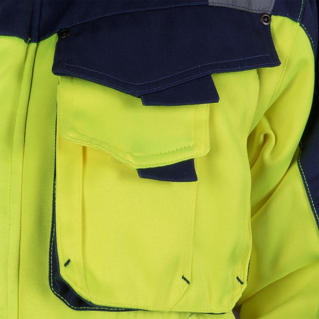 Zimná reflexná bunda vyrobená z fluorescenčnej látky. - vrchný materiál 86% polyester, 14% bavlna s gramážou 300 g/m2 - výplne z tmavomodrej látky 65% polyester, 35% bavlna s gramážou 290 g/m2 - výplň 100% polyester s gramážou 160 g/m2 - podšívka 100% polyester s gramážou 60 g/m2 - zips s dodatočným zapínaním na suchý zips v spodnej a hornej časti - odnímateľná kapucňa so sťahovacími šnúrkami a dodatočným zapínaním na suchý zips pre lepšiu ochranu hlavy pred chladom - dve spodné vrecká so zipsami a dodatočným zapínaním na suchý zips a tri náprsné vrecká so zapínaním na suchý zips - ďalšie vrecká na rukáve - rukávy so zapínaním na suchý zips, takže sa dajú nastaviť - na spodných častiach bundy a rukávov sú reflexné segmentované pruhy - zaisťuje dobrú viditeľnosť používateľa - ideálna pre cestných pracovníkov a policajné zložky - spĺňa požiadavky normy EN ISO 20471 (trieda 2)