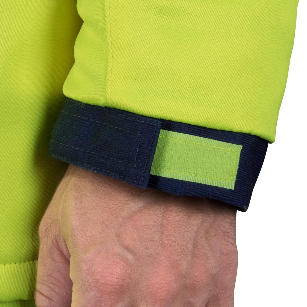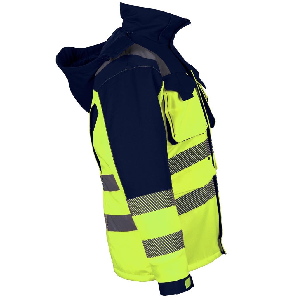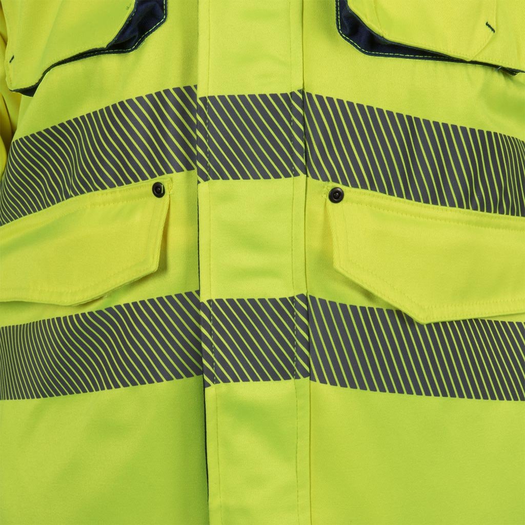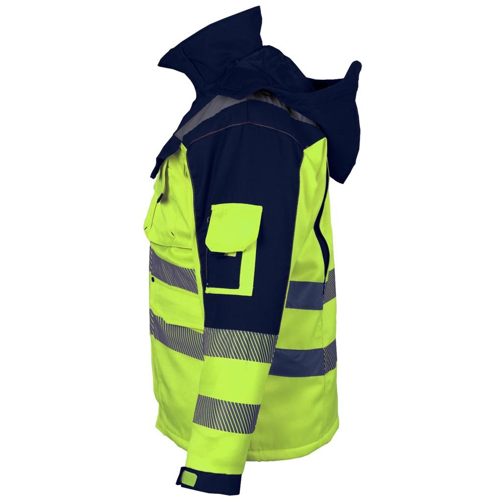 Zimná reflexná bunda vyrobená z fluorescenčnej látky. - vrchný materiál 86% polyester, 14% bavlna s gramážou 300 g/m2 - výplne z tmavomodrej látky 65% polyester, 35% bavlna s gramážou 290 g/m2 - výplň 100% polyester s gramážou 160 g/m2 - podšívka 100% polyester s gramážou 60 g/m2 - zips s dodatočným zapínaním na suchý zips v spodnej a hornej časti - odnímateľná kapucňa so sťahovacími šnúrkami a dodatočným zapínaním na suchý zips pre lepšiu ochranu hlavy pred chladom - dve spodné vrecká so zipsami a dodatočným zapínaním na suchý zips a tri náprsné vrecká so zapínaním na suchý zips - ďalšie vrecká na rukáve - rukávy so zapínaním na suchý zips, takže sa dajú nastaviť - na spodných častiach bundy a rukávov sú reflexné segmentované pruhy - zaisťuje dobrú viditeľnosť používateľa - ideálna pre cestných pracovníkov a policajné zložky - spĺňa požiadavky normy EN ISO 20471 (trieda 2)