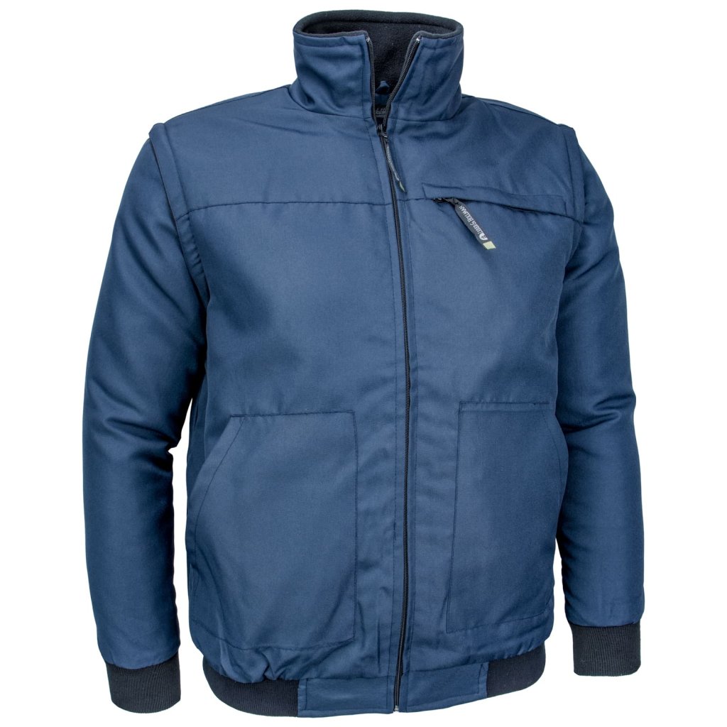 Pánska zimná zateplená pracovná bunda 2 v 1 s flišovou pošívkou. - Materiál: 100 % polyester Oxford s polyuretánovým povlakom 185 g/m² - Podšívka rukávov: 100 % polyester 100 g/m² - Flísová podšívka: polyester 280 g/m², rukávy: taft 100 % polyester 60 g/m² - Zapínanie na zips - Stojatý golier s flísovou podšívkou - Dve spodné vrecká a jedno náprsné vrecko na zips - Ďalšie vnútorné vrecko na zips a vrecko na mobilný telefón na suchý zips - Odnímateľné rukávy na zips s elastickými manžetami - Elastický spodný lem