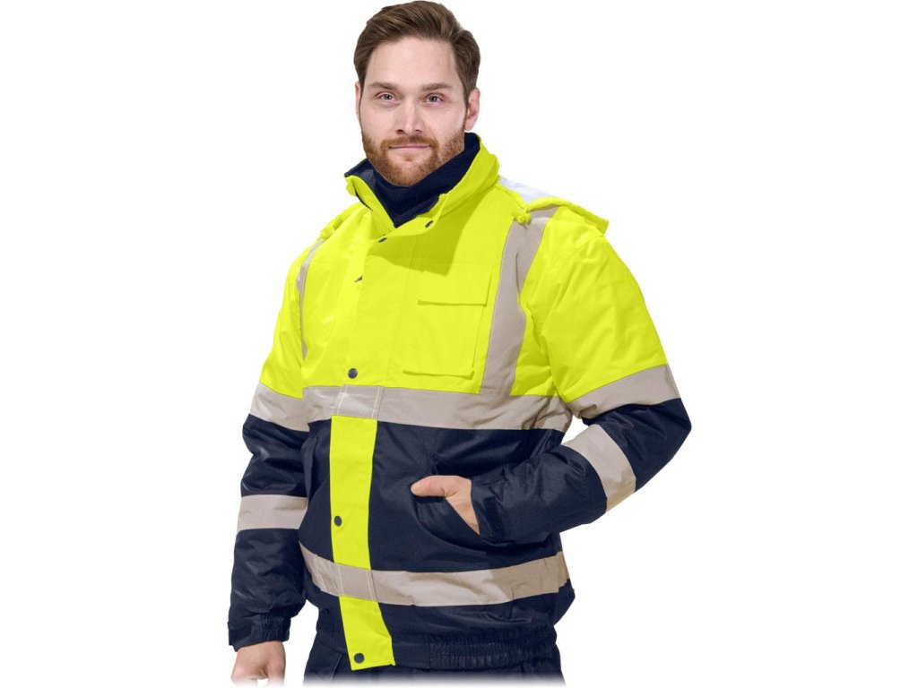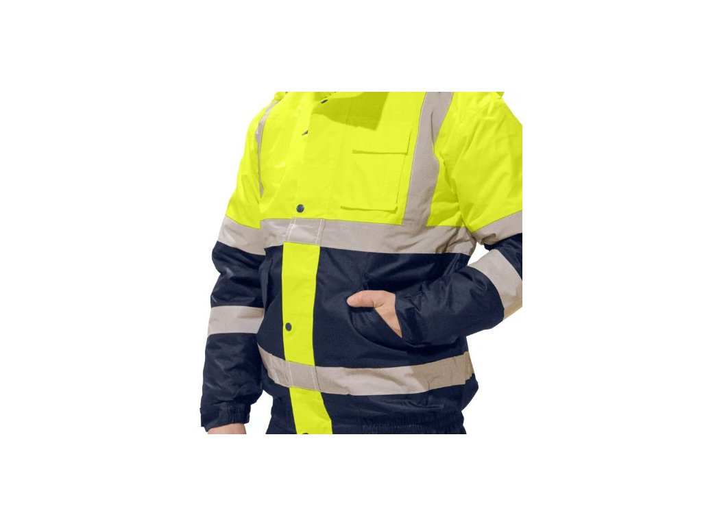 Zimná zateplená pracovná bunda pre mužov reflexná REIS. - Materiál: 100% 300D 180g/m² s polyuretánovým povlakom, 100% polyester Oxford - Výplň: 180g/m² - Podšívka: 100% taft 60g/m² - Zapínanie na obojsmerný zips s dodatočným zapínaním na patentný cvok - Stojatý golier s flísovou podšívkou - Kapucňa so sťahovacími šnúrkami, ktoré sa dajú zrolovať a uložiť do goliera - Dve spodné vrecká a jedno náprsné vrecko - Vrecko na suchý zips na ľavom rukáve - Ďalšie vnútorné vrecko - Rebrované manžety a lem - Fluorescenčná tkanina a reflexné pruhy pre zvýšenú viditeľnosť - Ideálne pre cestných príslušníkov a iných príslušníkov orgánov činných v trestnom konaní - Strih: REGULAR